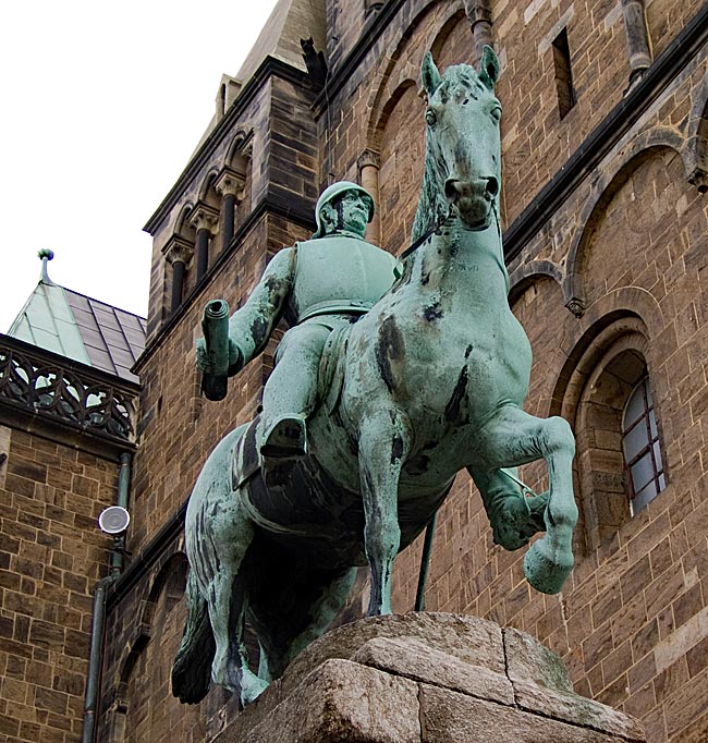 Zwischen Neptun-Brunnen und Dom thront auf einem Sockel hoch zu Ross der "Eiserne Kanzler", Otto von Bismarck, der erste Kanzler des Deutschen Reichs. Bismarck war bereits 1871 zum Ehrenbürger Bremens ernannt worden und noch vor seinem Tod hatte der Senat eine Straße nach ihm benannt, dennoch war die Einweihung des pompösen Denkmals 1910 nicht unumstritten, wie der Kanzler selbst es auch gewesen war. Im Zweiten Weltkrieg wurde das einzige existierende Reiterstandbild von Bismarck in der Außenseite des Doms eingemauert und nach langen Kontroversen erst 1953 wieder aufgestellt. Doch Anfang 2018 steht die Bronzestatue auf bröckeldem Fundament, der ungewöhnlich hohe Sockel wie derer zweier Standbilder bedeutender Heerführer der Städterepubliken Venedig und Padua im Italien des 15. Jh. ist marode. Und wieder wird von nicht wenigen Seiten die Frage gestellt, ob man diesem Politiker, dem viele einen Vorbildcharakter absprechen, unbedingt ein Denkmal setzen bzw. nun unter erheblichem finanziellen Einsatz erhalten muss. Eine Diskussion, die 2017 anlässlich eines Sanierungsbedarfs von 6,5 Mio Euro auch in Hamburg geführt wurde, wo seit 1906 das weltweit größte Bismarckdenkmal (34,3 m) steht.