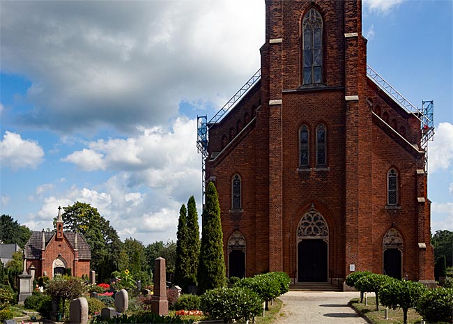 Ob arm oder reich, im Tod sind doch alle Menschen gleich. Die 45 Meter hohe evangelische neogotische Pfarrkirche St. Johann wurde 1860 fertiggestellt und steht seit 1999 unter Denkmalschutz, wie auch die Friedhofskapelle (1905) im Hintergrund.