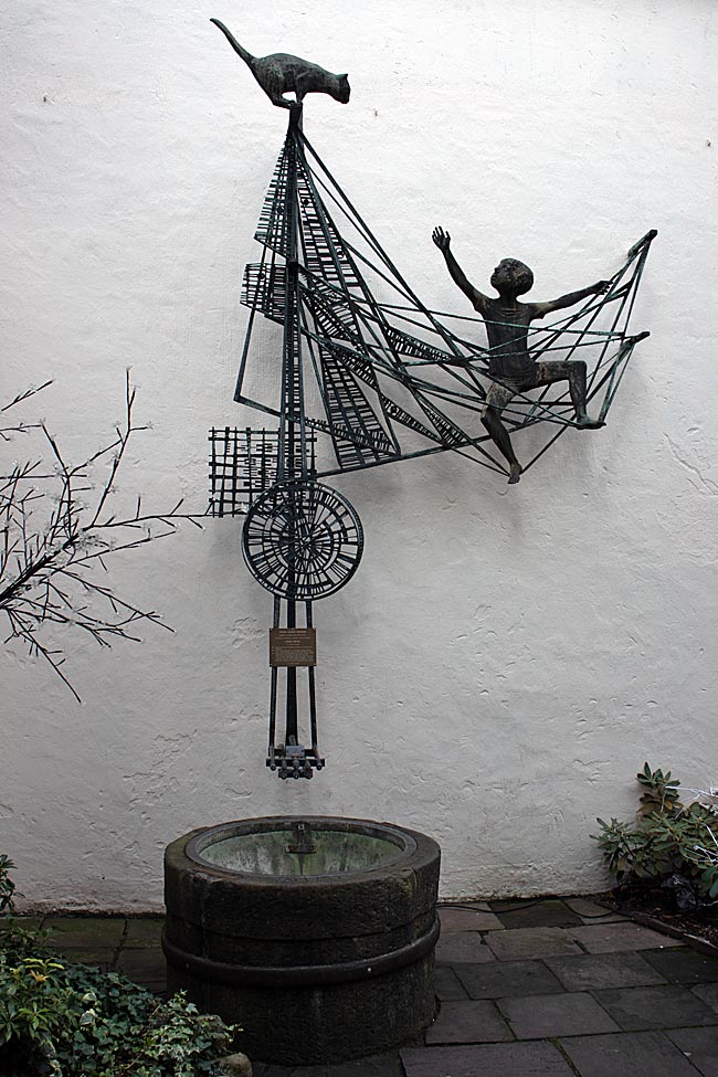 Wasser fließt auch am Ottjen-Alldag-Brunnen, wenn auch nicht immer, wie das Foto zeigt. Die Plastik des Brunnens stammt ebenfalls von Claus Homfeld. Die Figur Ottjen Alldag entstammt der gleichnamigen Roman-Trilogie mit des plattdeutschen Schriftstellers Georg Droste (1866-1935). Die erzählte Geschichte des Jungen, das Hauptwerk des Autors, trägt wesentlich autobiografische Züge. Neben dem Brunnen wird mit einem Auszug aus seinem literarischen Schaffen in Lettern an einer Hauswand an den Schriftsteller aus Bremen erinnert - natürlich auf Platt.