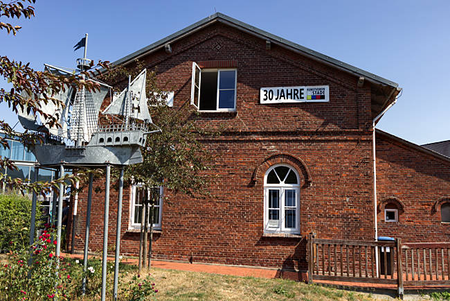 Aber es gibt auch Kultur, nämlich in Gestalt des Kunstvereins Stade e. V. im Schleusenhaus. In den Räumlichkeiten neben den mächtigen Schleusentoren finden regelmäßig Kunstausstellungen statt.